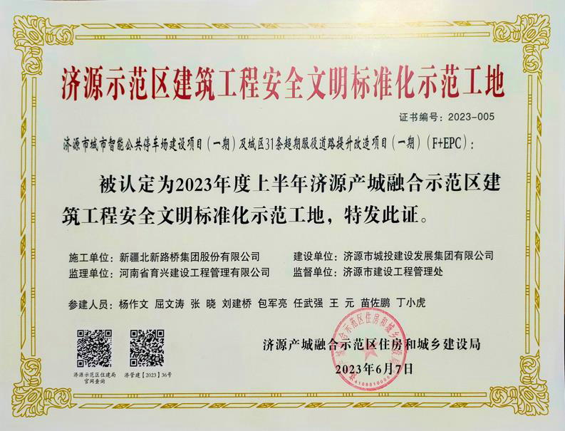 近日,北新路橋集團(tuán)西安分公司濟(jì)源市政工程項目榮獲“濟(jì)源示范區(qū)建筑工程安全文明標(biāo)準(zhǔn)化示范工地”稱號。