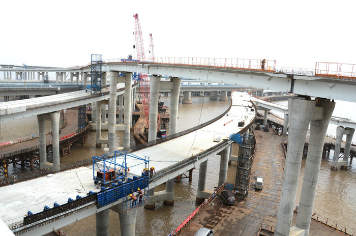目前,濱海互通架梁436片,占470片總量的90.15%,除完成B匝道架梁外, G、E、F、H等4座匝道在之前已經(jīng)架設(shè)完畢,其中F匝道成功上跨金塘大橋,6月25—28日,A、D兩座匝道橋也將上跨金塘大橋。