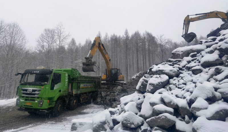 為了應對長白山腹地暴雪、冰凍、寒流等極端天氣頻發(fā)狀況,項目部提前對路窄、坡陡、彎急道路的錯車平臺進行了修繕加固。3支清雪突擊隊嚴陣以待,做到了隨下隨清,保證車輛運輸?shù)陌踩珪惩āD壳绊椖恳褍涠┬枰闹猩?.7萬立方米、巖棉保溫被13600平方米、防滑爐灰3000立方米、融雪劑176噸等物資,冬施期間物料儲量充足。