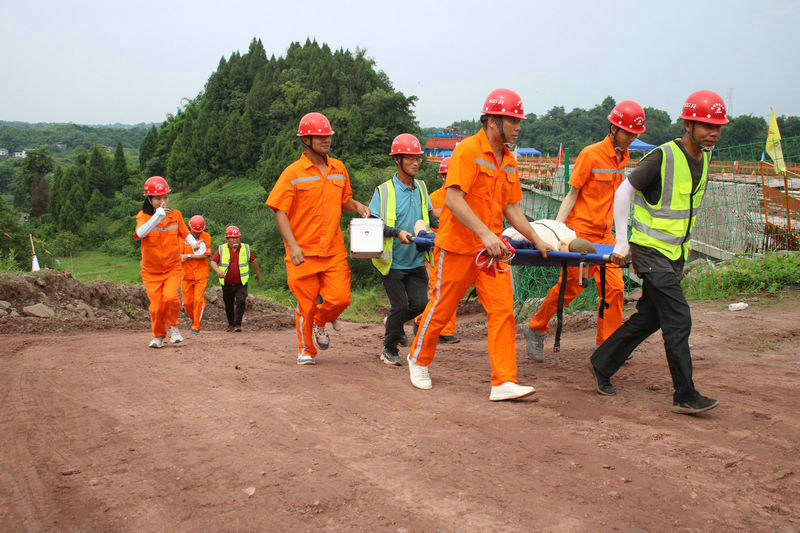 上午10時,應(yīng)急救援演練正式開始:正在萬福大橋橋面鋪裝臨邊作業(yè)的一名“工人”不慎摔下8米高的橋底,“不好啦,有人掉下去了”,工友大聲呼喊,現(xiàn)場安全員和班組長迅速到達(dá)出事地點查看“傷情”,并立即撥打120電話及時報告項目經(jīng)理。“馬上啟動項目應(yīng)急預(yù)案,各應(yīng)急小組立即趕往事故現(xiàn)場”,項目經(jīng)理接到電話后立即作出救援部署,隨后帶領(lǐng)醫(yī)療救護(hù)組、安全保衛(wèi)組、技術(shù)保障組和疏散引導(dǎo)組小組人員,迅速趕往事故現(xiàn)場開展“傷員”救護(hù)、工人疏散、外圍警戒、現(xiàn)場清理等工作,并協(xié)助120救護(hù)車轉(zhuǎn)送“傷員”至就近醫(yī)院......,整個演練過程持續(xù)約40分鐘,按照應(yīng)急預(yù)案有序推演,演練取得了圓滿成功。