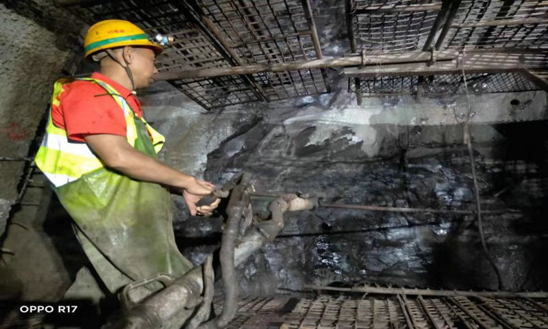 工人在中梁山隧道作業(yè)現(xiàn)場鉆炮眼