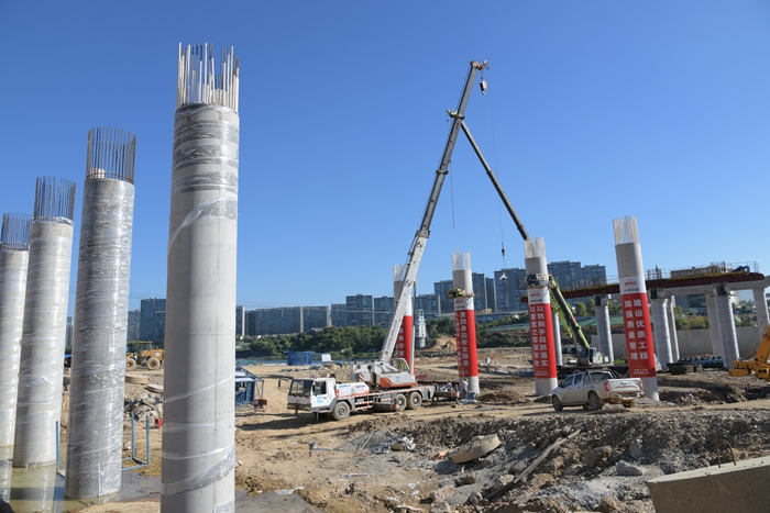 富足山舊橋位于城區(qū)文峰路上,全長300米、寬18米、高19米,運行30年,是常山縣33.6萬人出行,與杭州、江西上饒等地密切聯(lián)系的重要通道,被當(dāng)?shù)厝朔Q為民生橋。新建富足山大橋在舊橋原址上,與天馬樞紐泄洪閘相距約30米,橋墩和橋面橫跨導(dǎo)流墻。該橋全長376.8米、11垮、高19米、寬27.5米,直徑1.5—1.8米的樁基46根,直徑1.7米的墩柱42個,9、10垮為通航通道,上部為T梁結(jié)構(gòu),橋面兩側(cè)各增加2.75米寬的人行道和3米寬的非機動車道。2024年11月開工建設(shè)。該項目在樁基施工中,利用冬春雨水少的特點,從兩端向中間推進,為橋墩施工創(chuàng)造了條件。今年汛期過后,項目部建起一座100多米長的漫水橋,右側(cè)5排20根墩柱和蓋梁完成后,填筑起一座6米多高的圍堰,將常山江水改變流向,從完工的墩柱位置流過,抽干左側(cè)河道的積水,組織人力和機械進行樁基施工。在墩柱施工中,采取在破樁頭后的樁基上綁扎鋼筋籠、安裝定型鋼模、一次性灌注的辦法,使拆模后的墩身顏色一致、光潔如玉,受到業(yè)主、監(jiān)理單位的好評。