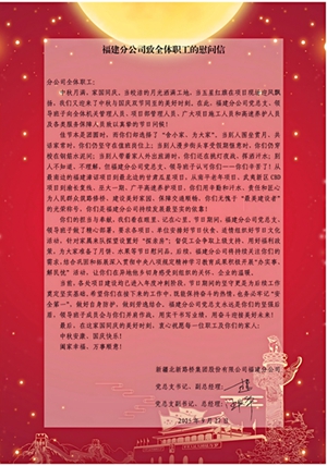 南平訊(馬軼鋒)中秋、國(guó)慶雙節(jié)將至,北新路橋集團(tuán)福建分公司發(fā)布《福建分公司致全體職工的慰問(wèn)信》,充分肯定全體職工在各業(yè)務(wù)范圍、各工作崗位付出的努力和為分公司發(fā)展做出的貢獻(xiàn),代表黨總支、領(lǐng)導(dǎo)班子向全體職工送上節(jié)日的祝福。