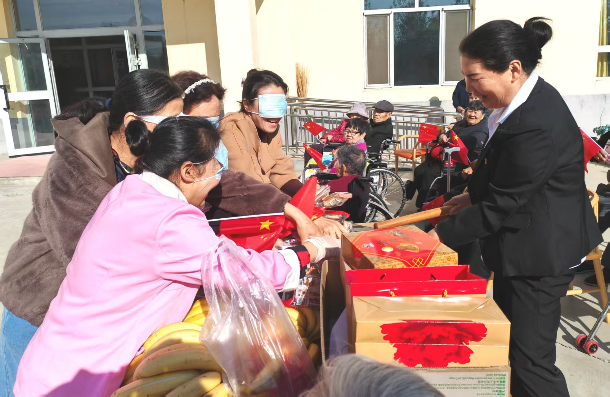 圖4為:第六師奇臺(tái)110團(tuán)社區(qū)吾家樂(lè)寶養(yǎng)老院院長(zhǎng)史云智(左一),在中秋佳節(jié)組織員工們與長(zhǎng)者、家屬開(kāi)展趣味互動(dòng)游戲,歡聲連連。