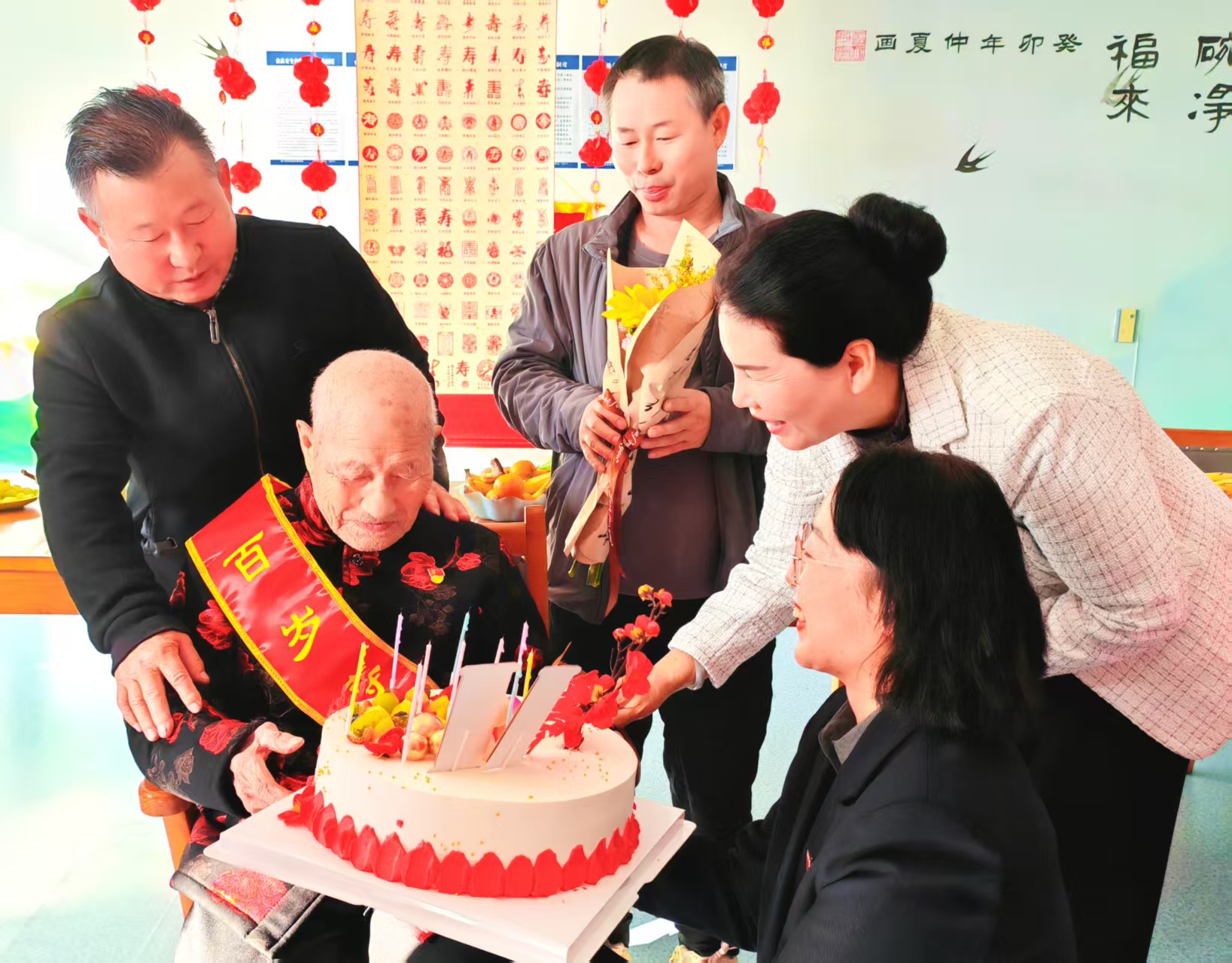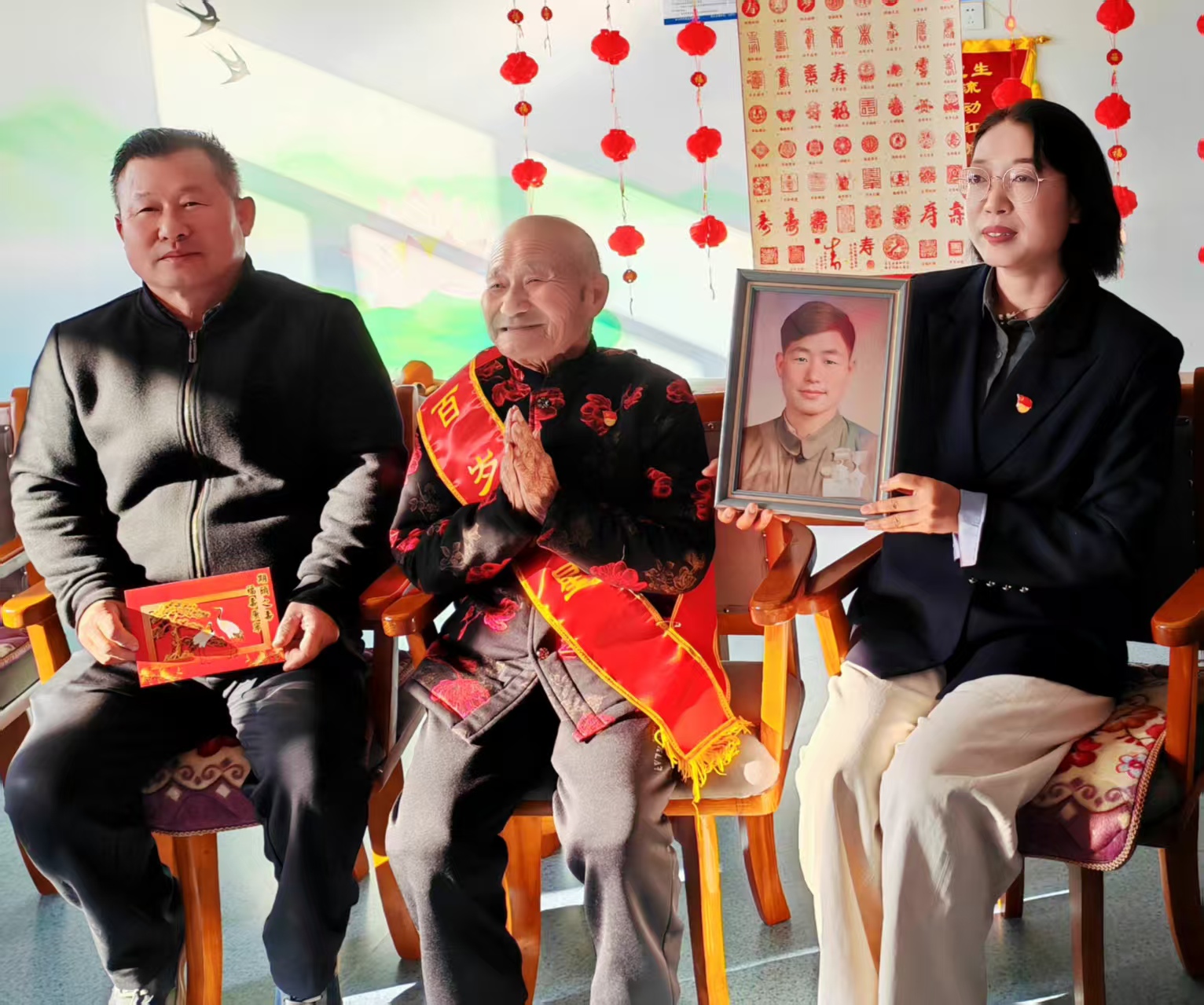 圖1為:10月18日,在開展“敬老月”活動中,三十里大墩社區(qū)王娜書記(左一)、六師奇臺農(nóng)場110社區(qū)吾家樂寶養(yǎng)老院院長史云智(左三),為入住該養(yǎng)老院的百歲老爺爺李文生(左二),佩戴黨徽,送來生日祝福,為李爺爺精心籌備舉辦了“生日會”。陪伴李爺爺?shù)募胰藗優(yōu)槔顮敔斶^“期頤之壽”,讓兵團(tuán)第一代建設(shè)者李文生老爺爺切身感受到了全社會的關(guān)心與關(guān)愛。