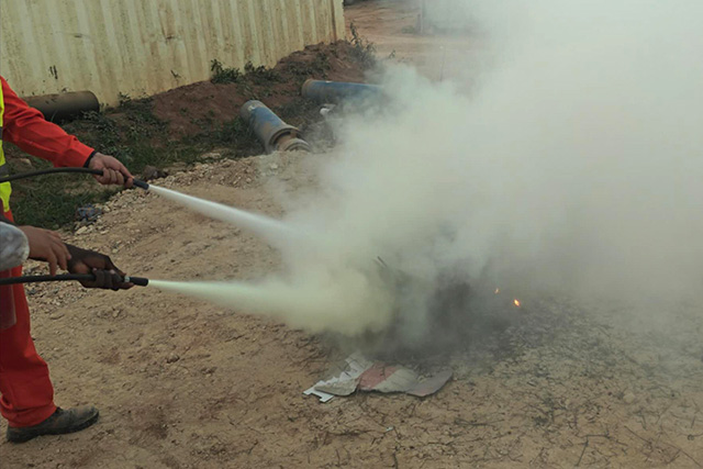 安哥拉地處非洲南部氣候干燥,植被易燃,火災風險較高。松貝項目緊密結合當?shù)貧夂蛱攸c與施工實際,精心制定演練方案,將理論培訓與實戰(zhàn)操練有機融合。在培訓環(huán)節(jié),安全負責人系統(tǒng)講解了施工區(qū)域火災風險識別、初期火災撲救方法、消防器材規(guī)范使用等內(nèi)容,并重點解讀了項目應急預案中的報警響應、人員疏散、協(xié)同救援等關鍵流程。通過真實案例復盤,直觀展示了火災事故的嚴重危害,進一步強化了全員“隱患零容忍、防控無死角”的安全意識。